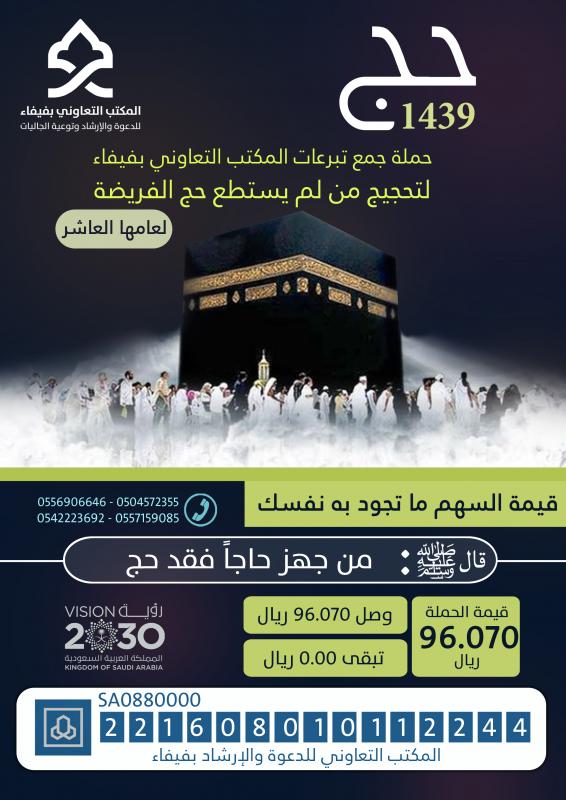 بفضل الله ثم بدعمكم تم اكتمال حملة جمع تبرعات المكتب التعاوني بفيفاء لتحجيج من لم يستطع حج الفريضة لعامها العاشر