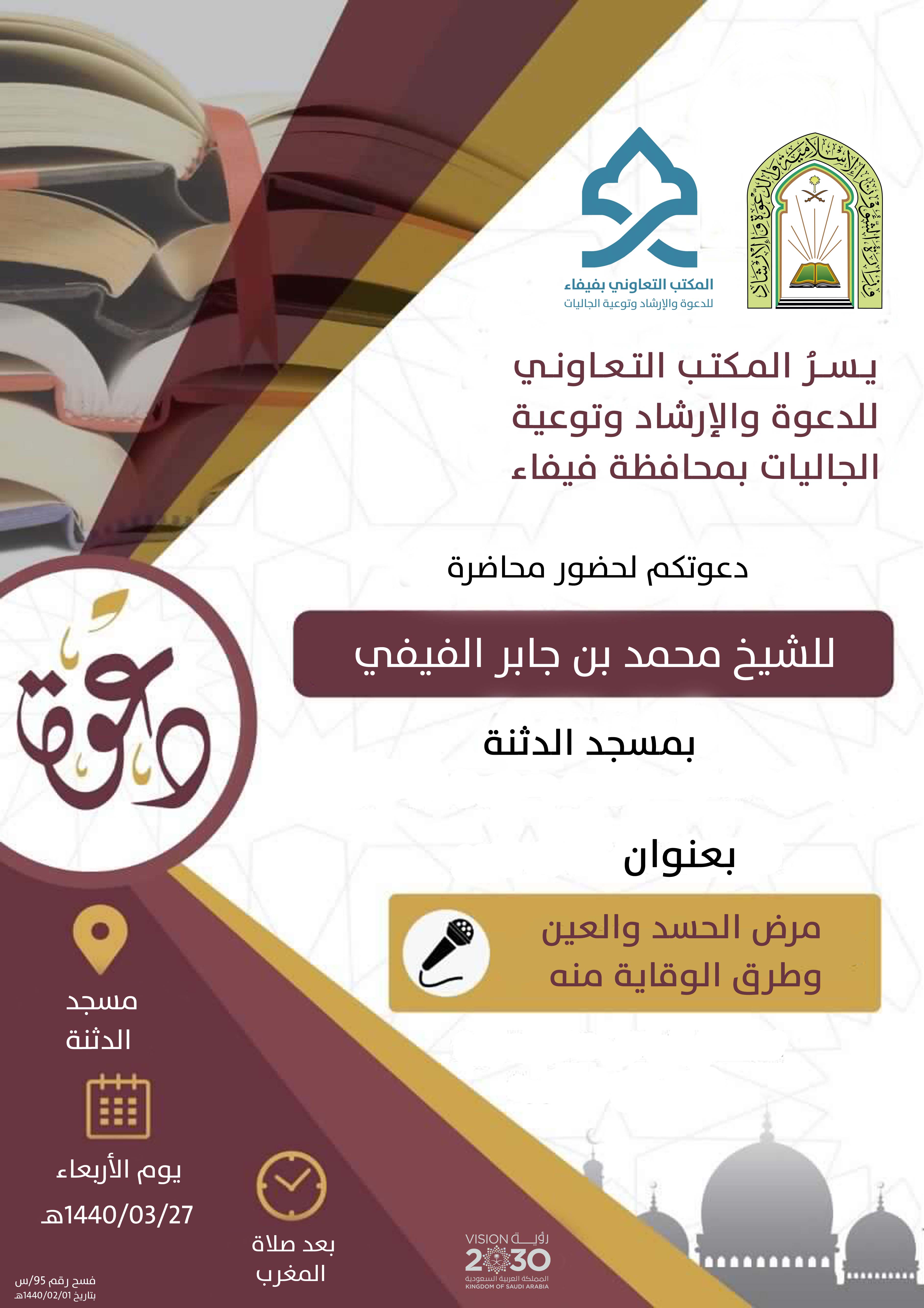 يعلن المكتب التعاوني للدعوة والإرشاد وتوعية الجاليات بمحافظة فيفاء عن إقامة محاضرة بعنوان مرض الحسد والعين وطرق الوقاية منه