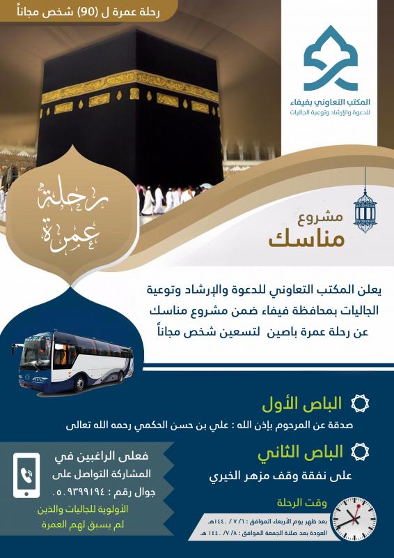 يعلن المكتب التعاوني للدعوة والإرشاد وتوعية الجاليات بمحافظة فيفاء ضمن مشروع مناسك عن رحلة عمرة باصين لتسعين شخص مجاناً الباص الأول صدقة عن علي بن حسن الحكمي رحمه الله تعالي والباص الثاني على نفقة وقف مزهر الخيري فعلى الراغبين في المشاركة التواصل على جوال رقم : 0509399194