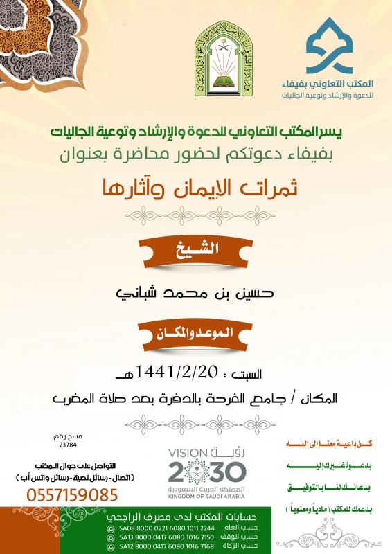يعلن المكتب التعاوني للدعوة والإرشاد وتوعية الجاليات بمحافظة فيفاء عن إقامة محاضرة للشيخ / حسين بن محمد شباني بعنوان ثمرات الأيمان وآثارها وذلك بجامع الفرحة بالدفرة بعد صلاة المغرب يوم السبت الموافق 20/2/1441هـ .