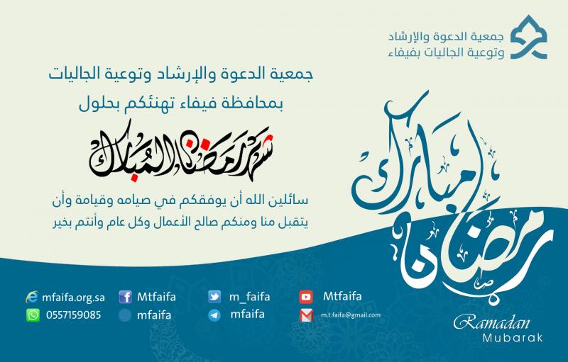 جمعية الدعوة والإرشاد وتوعية الجاليات بمحافظة فيفاء تهنئكم بحلول شهر رمضان المبارك سائلين الله أن يوفقكم في صيامه وقيامة وأن يتقبل منا ومنكم صالح الأعمال وكل عام وأنتم بخير