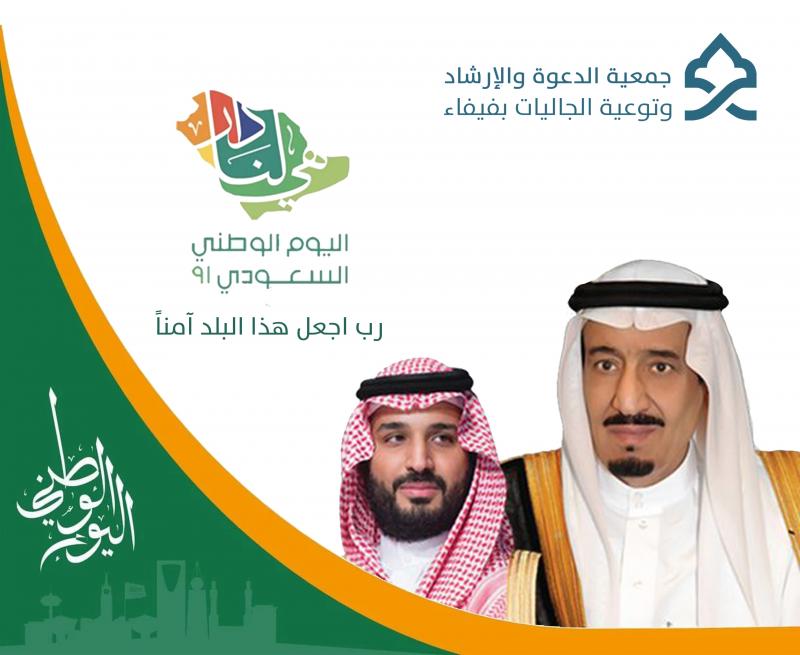 رئيس وأعضاء مجلس إدارة جمعية الدعوة والإرشاد وتوعية الجاليات بمحافظة فيفاء يرفعون أسمى آيات التهاني والتبريكات لمقام خادم الحرمين الشريفين الملك سلمان بن عبدالعزيز آل سعود وإلى مقام صاحب السمو الملكي الأمير محمد بن سلمان آل سعود ولي العهد نائب رئيس مجلس الوزراء وزير الدفاع بمناسبة ذكرى اليوم الوطني الواحد والتسعين