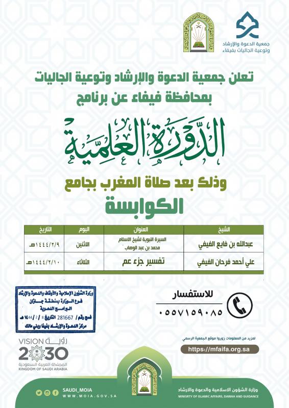 يسر جمعية الدعوة والإرشاد وتوعية الجاليات بمحافظة فيفاء دعوتكم لحضور برنامج الدورة العلمية وذلك بجامع الكوابسة بمحافظة فيفاء والتي تبدأ من بعد صلاة المغرب مباشرةً وذلك حسب التفاصيل آدنا :