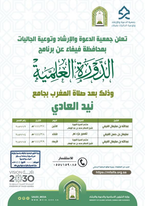 يسر جمعية الدعوة والإرشاد وتوعية الجاليات بمحافظة فيفاء دعوتكم لحضور برنامج الدورة العلمية وذلك بجامع نيد العادي بمحافظة فيفاء والتي تبدأ من بعد صلاة المغرب مباشرةً وذلك حسب التفاصيل آدنا :