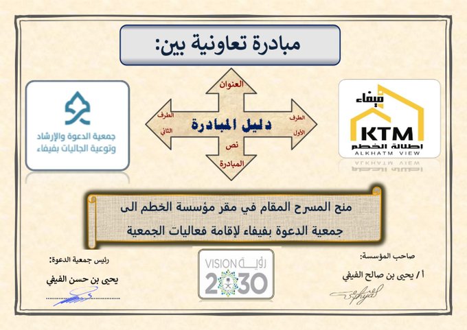 في خطوة ومبادرة فريدة تهدف إلى تعزيز الشراكة المجتمعية والتعاون بين الجهات تم بتوفيق الله توقيع مبادرة من مؤسسة الخطم بفيفاء ويمثلها صاحب المؤسسة الأستاذ / يحيى بن صالح الفيفي وجمعية الدعوة بفيفاء ويمثلها رئيس الجمعية الشيخ / يحيى بن حسن يحيى الفيفي