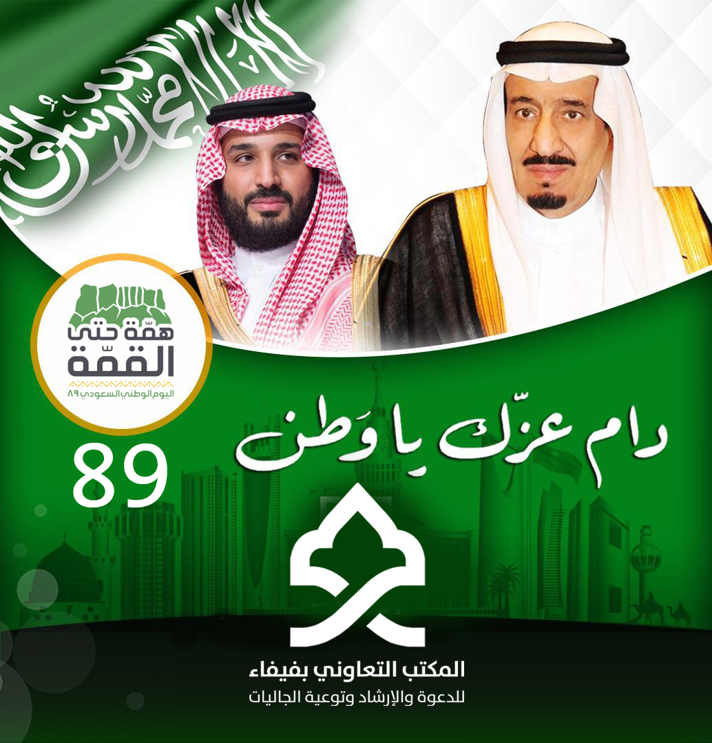 يتقدم المكتب التعاوني للدعوة والإرشاد وتوعية الجاليات بمحافظة فيفاء بتهنئة خادم الحرمين الشريفين الملك سلمان بن عبدالعزيز آل سعود، وصاحب السمو الملكي الأمير محمد بن سلمان بن عبدالعزيز آل سعود، ولي العهد نائب رئيس مجلس الوزراء وزير الدفاع، حفظهما الله، والأسرة المالكة، والشعب السعودي الكريم، بمناسبة اليوم الوطني 89، الذي يوافق يوم الاثنين 24 محرم 1441هـ ، سائلين الله - العلي القدير - أن يديم الله على هذه البلاد أمنها واستقرارها تحت رعاية خادم الحرمين الشريفين، وولي عهده الأمين.