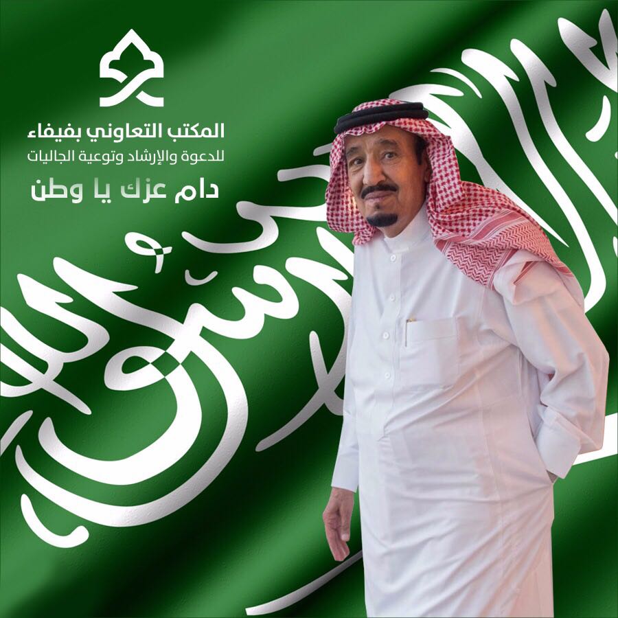 يتقدم المكتب التعاوني للدعوة والإرشاد وتوعية الجاليات بمحافظة فيفاء بتهنئة خادم الحرمين الشريفين الملك سلمان بن عبدالعزيز آل سعود، وصاحب السمو الملكي الأمير محمد بن سلمان بن عبدالعزيز آل سعود، ولي العهد نائب رئيس مجلس الوزراء وزير الدفاع، حفظهما الله، والأسرة المالكة، والشعب السعودي الكريم، بمناسبة اليوم الوطني 88، الذي يوافق هذا اليوم الأحد 13 المحرم 1440هـ، سائلين الله - العلي القدير - أن يديم الله على هذه البلاد أمنها واستقرارها تحت رعاية خادم الحرمين الشريفين، وولي عهده الأمين.