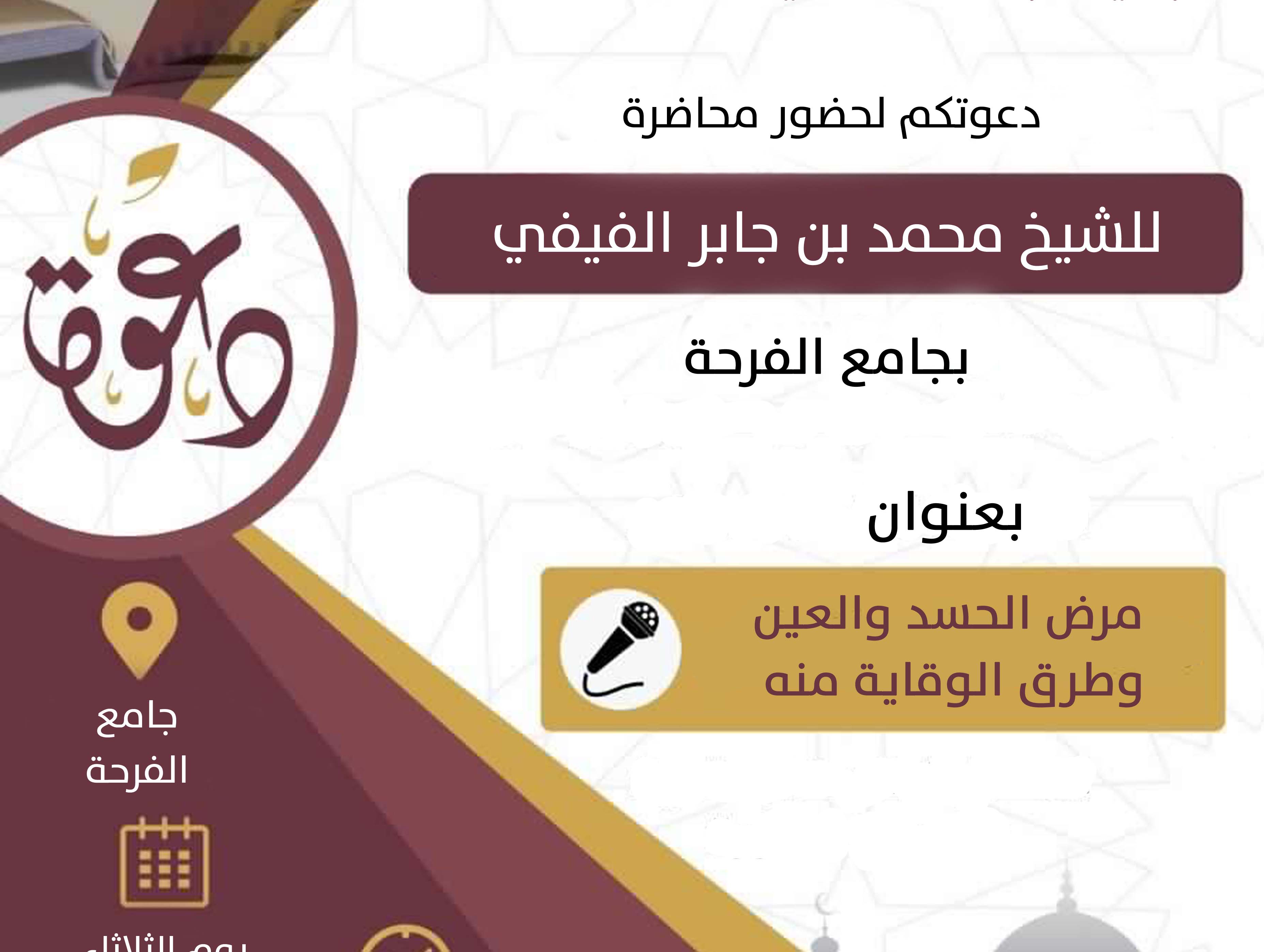 يعلن المكتب التعاوني للدعوة والإرشاد وتوعية الجاليات بمحافظة فيفاء عن إقامة محاضرة بعنوان مرض الحسد والعين وطرق الوقاية منه للشيخ / محمد بن جابر الفيفي وذلك بجامع الفرحة يوم الثلاثاء الموافق 5/3/1440هـ بعد صلاة المغرب .