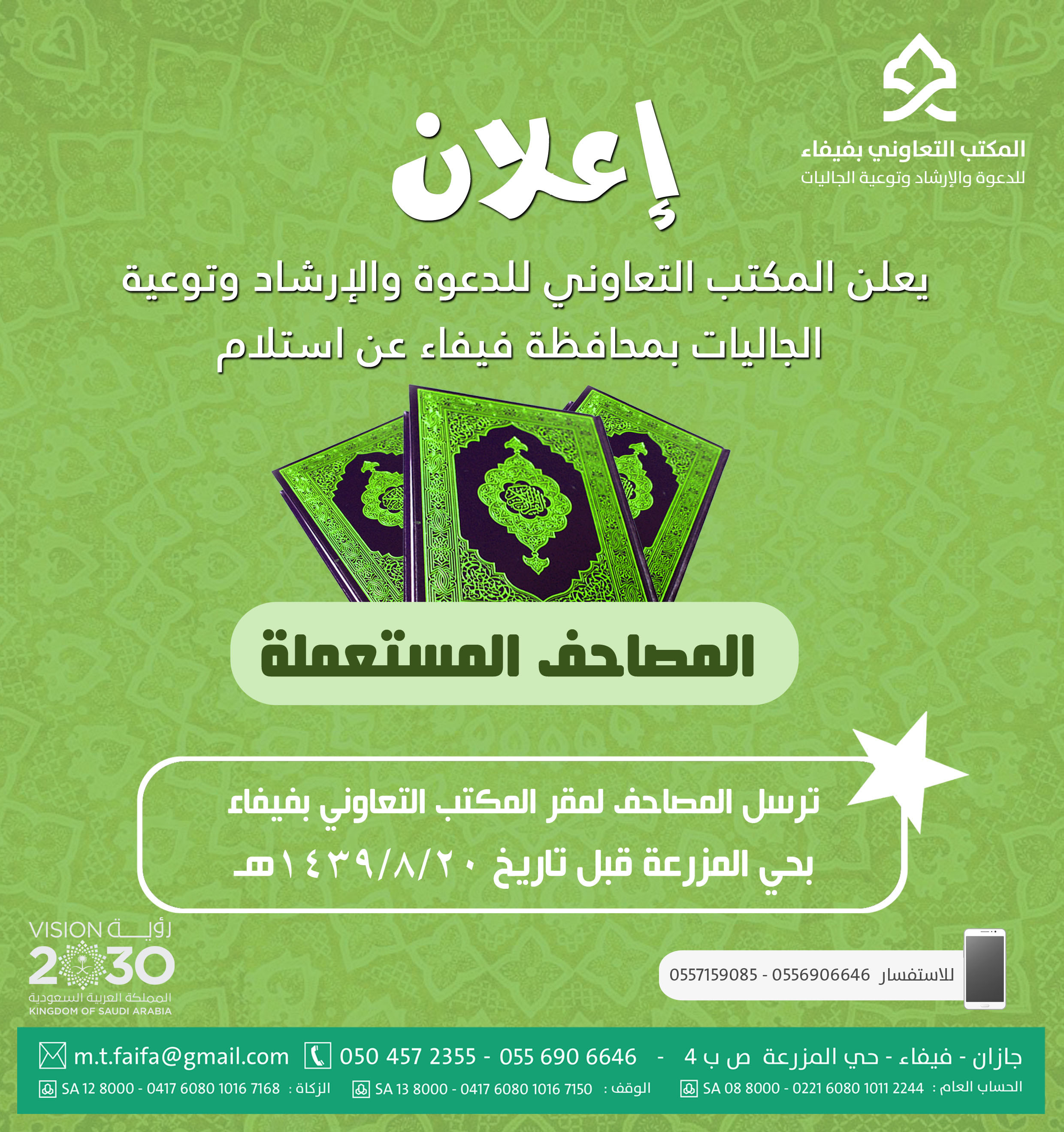 يعلن المكتب التعاوني للدعوة والإرشاد وتوعية الجاليات بمحافظة فيفاء عن استلام المصاحف المستعملة