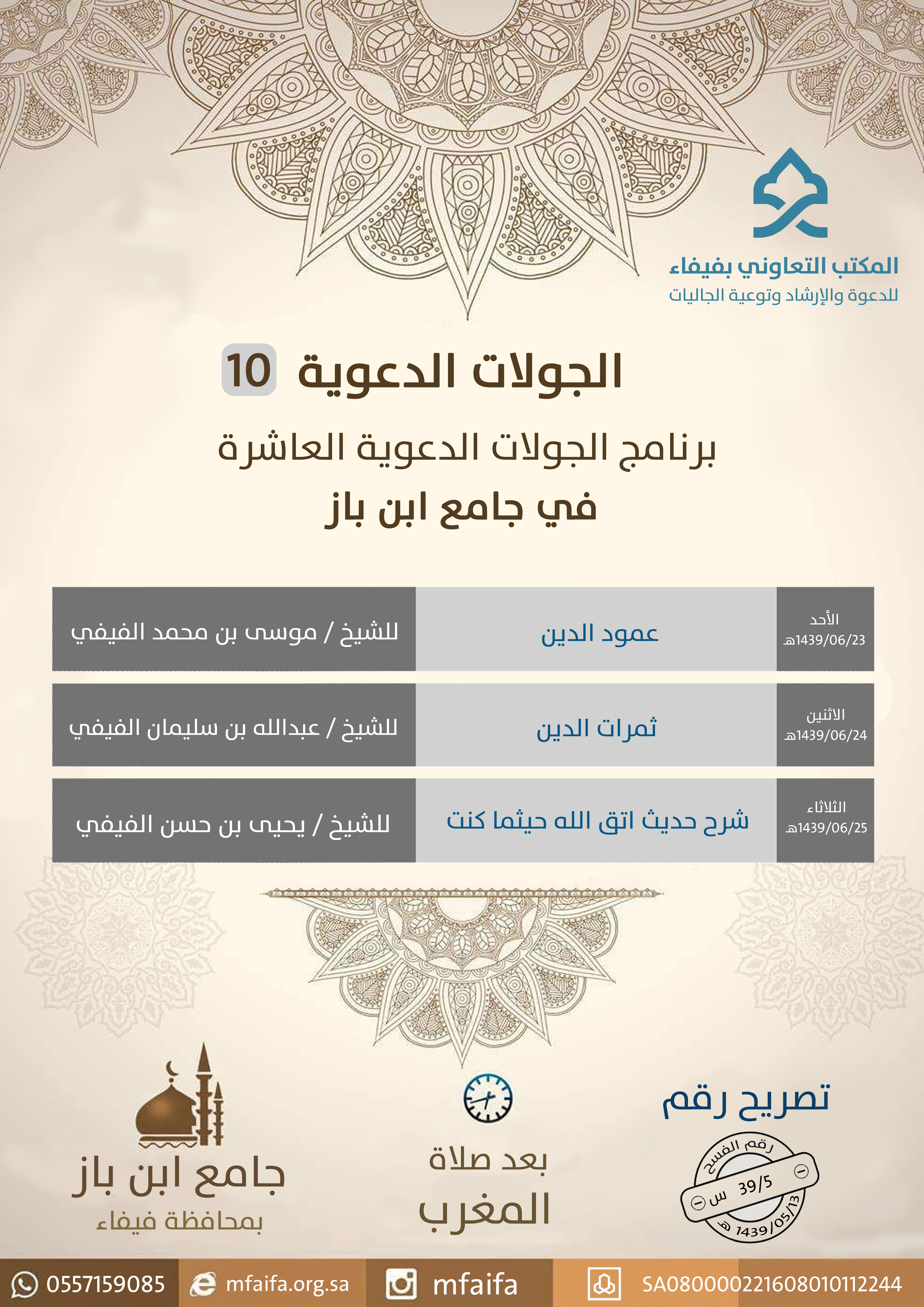 يعلن المكتب التعاوني للدعوة والإرشاد وتوعية الجاليات بمحافظة فيفاء عن انطلاق الجولة الدعوية العاشرة مساء هذا اليوم الموافق 23/06/1439هـ بجامع ابن باز ولمدة ثلاثة أيام من بعد صلاة المغرب