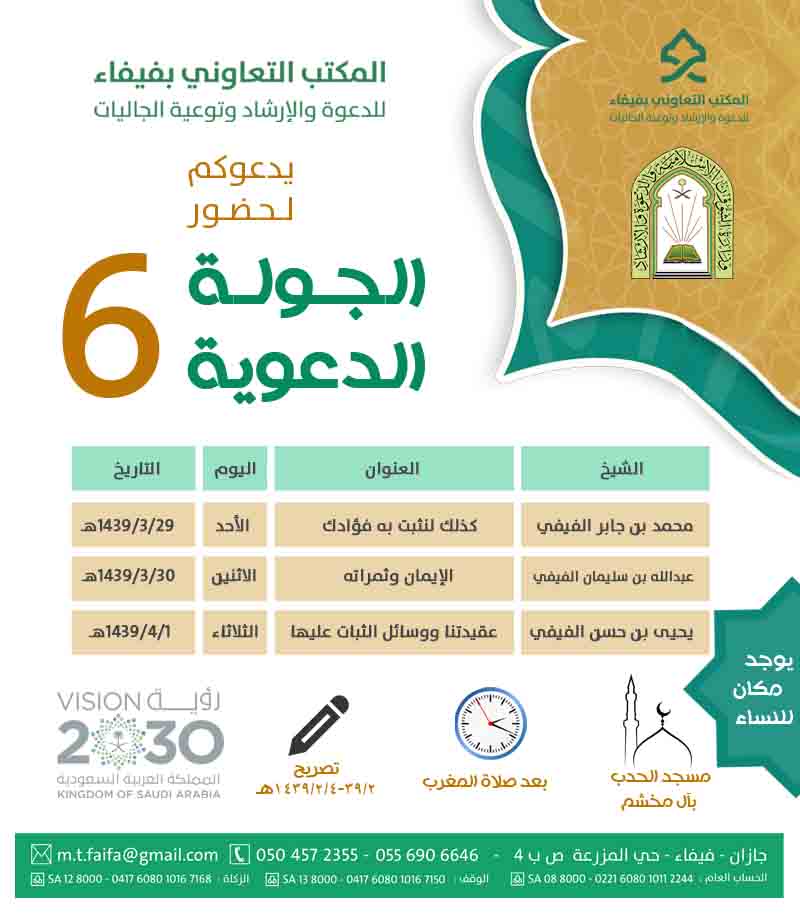 يعلن المكتب التعاوني للدعوة والإرشاد وتوعية الجاليات بمحافظة فيفاء عن إقامة الجولة الدعوية السادسة بمسجد الحدب بآل مخشم بعد صلاة المغرب .