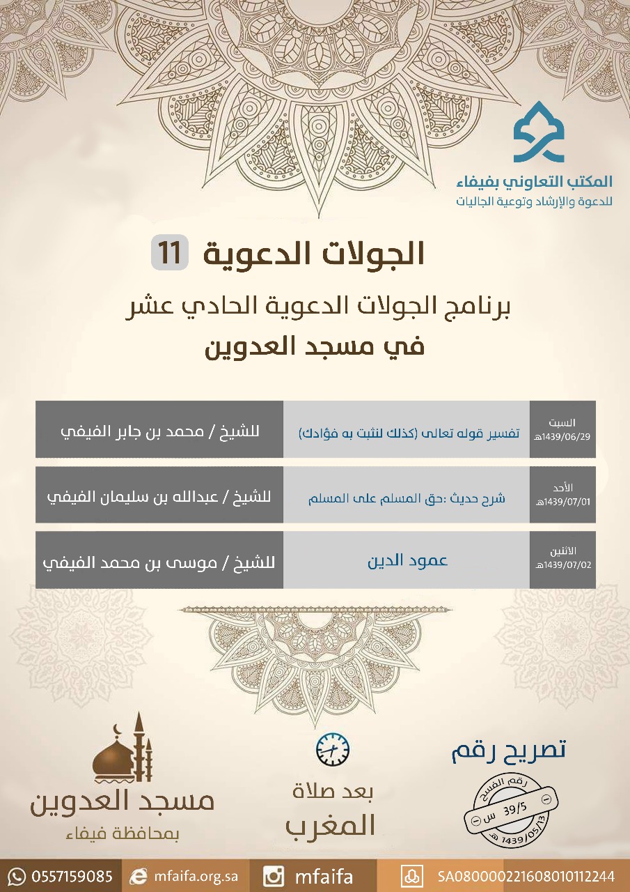يعلن المكتب التعاوني للدعوة والإرشاد وتوعية الجاليات بمحافظة فيفاء عن انطلاق الجولات الدعوية الخمس لهذا الأسبوع في كل من مسجد العدوين - جامع الثويعي - مسجد نيد مثمر - مسجد أوباد - جامع القاعة ولمدة ثلاثة أيام من بعد صلاة المغرب