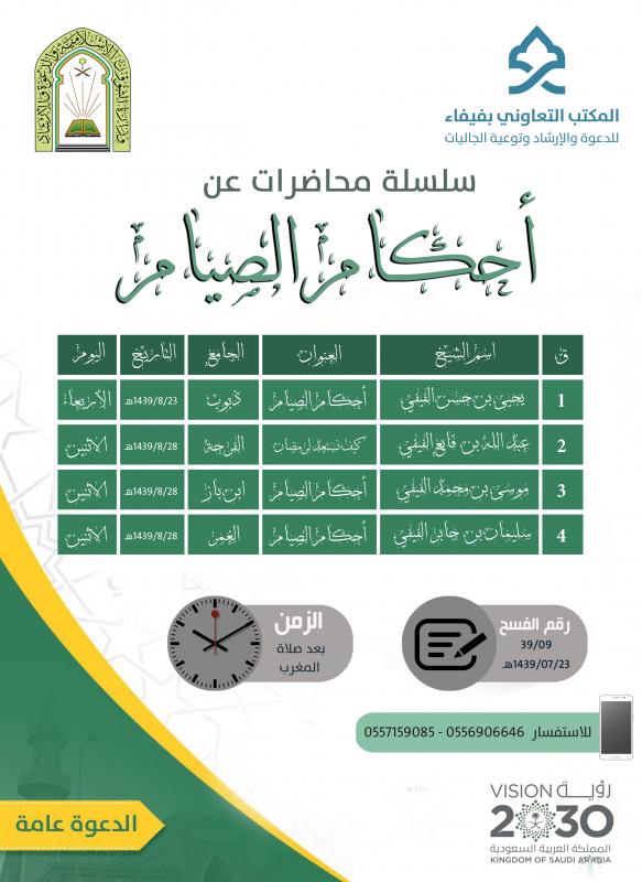 يعلن المكتب التعاوني للدعوة والإرشاد وتوعية الجاليات بمحافظة فيفاء عن إقامة سلسلة من المحاضرات عن أحكام الصيام قبل شهر رمضان المبارك وذلك حسب الجدول الموضح في الإعلان