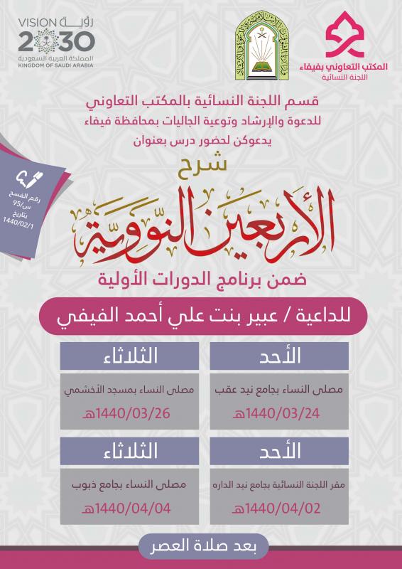 يعلن قسم اللجنة النسائية بالمكتب التعاوني للدعوة والإرشاد وتوعية الجاليات بمحافظة فيفاء عن إقامةأربعة دروس في شرح الأربعين النووية ضمن برنامج الدورات الأولية للداعية / عبير بنت علي أحمد الفيفي تبدأ من الأسبوع القادم يوم الأحد الموافق 24/3/1440هـ بمصلى النساء بجامع نيد عقب ويوم الثلاثاء الموافق 26/3/1440هـ بمصلى النساء بمسجد الأخشمي ويوم الأحد الموافق 2/4/1440هـ بمقر اللجنة النسائية بجامع نيد الدارة ويوم الثلاثاء الموافق 4/4/1440هـ بمصلى النساء بجامع ذبوب