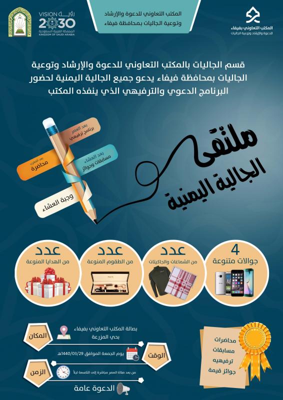 يدعو قسم الجاليات بالمكتب التعاوني للدعوة والإرشاد وتوعية الجاليات بمحافظة فيفاء جميع الأخوة من الجالية اليمنية لحضور البرنامج الدعوي والترفيهي يوم الجمعة الموافق 29/03/1440هـ من بعد صلاة العصر إلى الساعة التاسعة مساءً يتخلله برنامج ترفيهي - محاضرة - مسابقات وجوائز - وجبة عشاء وذلك بصالة المكتب التعاوني بفيفاء بحي المزرعة .