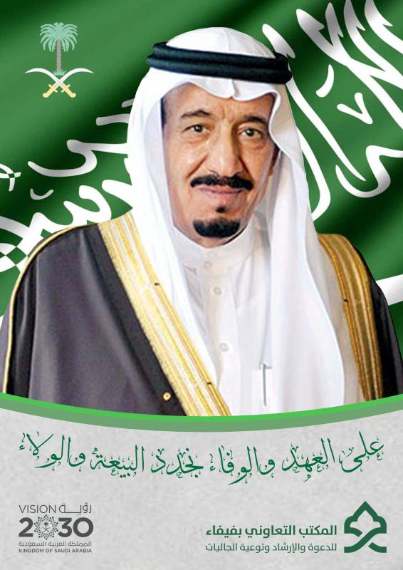 أعضاء وموظفو المكتب التعاوني للدعوة والإرشاد وتوعية الجاليات بمحافظة فيفاء يرفعون أسمى التهاني والتبريكات لمقام خادم الحرمين الشريفين الملك سلمان بن عبدالعزيز آل سعود - حفظه الله - معتزين ومجددين للبيعة والولاء في الذكرى الرابعة للبيعة لتوليه مقاليد الحكم لهذا الوطن المعطاء سائلين المولى جل وعلى أن يمن على هذا الوطن وأبنائه بنعمة الأمن والأمان والرخاء والتقدم والازدهار وسنواصل بإذن الله مسيرة البناء والتنمية للبلاد , في ظل السياسة الحكيمة التي ينتهجها الملك سلمان بن عبدالعزيز حفظه الله.