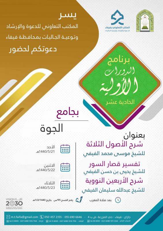 يعلن المكتب التعاوني للدعوة والإرشاد وتوعية الجاليات بمحافظة فيفاء عن برنامج الدورات الأولية الحادية عشر للعام الحالي 1440هـ وذلك بجامع الجوة ولمدة ثلاثة أيام من بعد صلاة المغرب يوم الأحد للشيخ موسى بن محمد الفيفي بعنوان شرح الأصول الثلاثة ويوم الاثنين للشيخ يحيى بن حسن الفيفي بعنوان تفسير قصار السور ويوم الثلاثاء للشيخ عبدالله بن سليمان الفيفي بعنوان شرح الأربعين النووية .