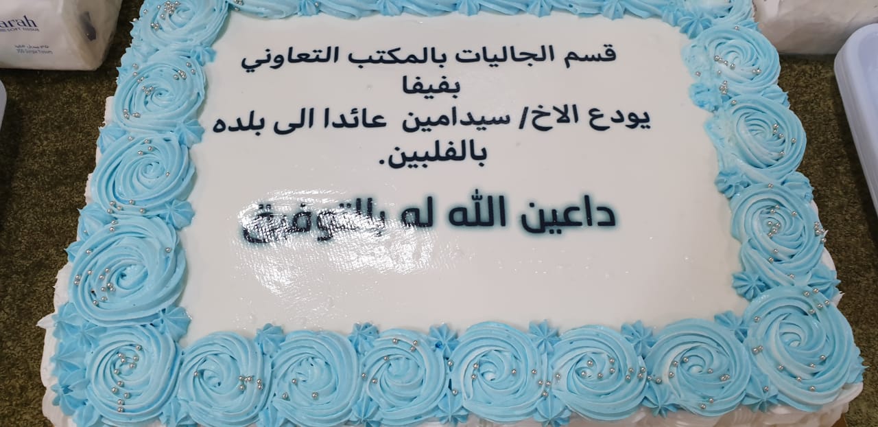 ودع قسم الجاليات بالمكتب التعاوني للدعوة بمحافظة فيفاء أحد أبرز متعاوني قسم الجاليات الأخ / سيد أمين يمام أمفا من الجنسية الفلبينة وقد أقيم له برنامج تكريم وتوديع بالتعاون مع نادي الحي بفيفاء وحيث بدأ البرنامج بألعاب ترفيهية ثم كلمة دعويه قدمها الداعيه الفلبيني /عمر وبعد ذلك قدم قسم الجاليات ونادي الحي بفيفاء له بعض الهدايا على ما قام به من أعمال وانجازات. في خدمة قسم الجاليات في الأعوام الماضية كما قدم له شهادة شكر وتقدير تقديرا لجهوده
