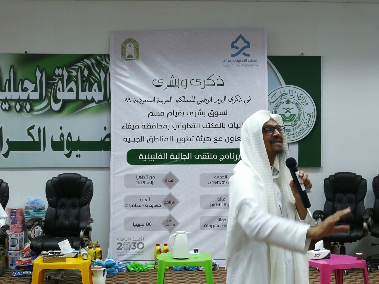 نفذ قسم الجاليات بالمكتب التعاوني للدعوة والإرشاد وتوعية الجاليات بمحافظة فيفاء يوم الجمعة الموافق 28/01/1441هـ برنامج ملتقى الجالية الفلبينية بالتعاون مع هيئة تطوير المناطق الجبلية حيث بدٲالبرنامج بعد صلاة الجمعة مباشرةً ببعض من البرامج الترفيهية ثم استراحة لتناول وجبة الغداء وبعد صلاة العصر افتتح البرنامج الدعوي الداعية / يوسف بوتستا الذي حضرنا من المكتب التعاوني بالجبيل تخلل البرنامج مسابقات والعاب وجوائز ثم بدٲفي المحاضرة الساعة الخامسة مساءً إلى قبيل صلاة العشاء وقد كان عدد الحضور الجاليات حوالي 90 شخصاً وفي نهاية المحاضرة أعلن خمسة من الرجال وثلاثة من النساء إسلامهم نسأل الله أن يثبتهم ويجعلهم دعاة خير في أهلهم . وأن يكتب الأجر والمثوبة لكل من دعم المكتب التعاوني وأن يخلف عليهم بالبركة في أعمارهم وأموالهم وأهليهم ونسأل الله أن يثبت المسلمين الجدد
