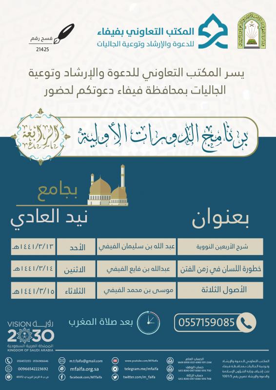 يعلن المكتب التعاوني للدعوة والإرشاد وتوعية الجاليات بمحافظة فيفاء عن برنامج الدورات الأولية الرابعة للعام الحالي 1441هـ وذلك بجامع نيد العادي ولمدة ثلاثة أيام من بعد صلاة المغرب يوم الأحد للشيخ عبدالله بن سليمان الفيفي بعنوان شرح الأربعين النووية ويوم الاثنين للشيخ عبدالله بن فايع الفيفي بعنوان خطورة اللسان في زمن الفتن ويوم الثلاثاء للشيخ موسى بن محمد الفيفي بعنوان شرح الأصوال الثلاثة .