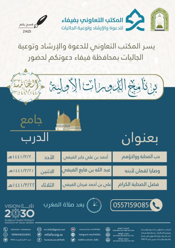 يعلن المكتب التعاوني للدعوة والإرشاد وتوعية الجاليات بمحافظة فيفاء عن برنامج الدورات الأولية الخامسة للعام الحالي 1441هـ وذلك بجامع الدرب ولمدة ثلاثة أيام من بعد صلاة المغرب يوم الأحد للشيخ أحمد بن علي الفيفي بعنوان حب الصحابة ووالاؤهم ويوم الاثنين للشيخ عبدالله بن فايع الفيفي بعنوان وصايا لقمان لأبنه ويوم الثلاثاء للشيخ علي بن أحمد الفيفي بعنوان فضل الصحابة الكرام .
