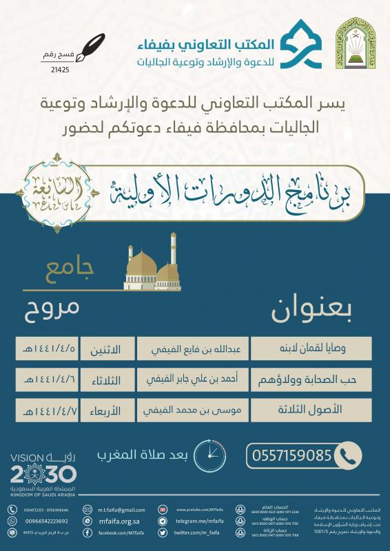 يعلن المكتب التعاوني للدعوة والإرشاد وتوعية الجاليات بمحافظة فيفاء عن برنامج الدورات الأولية السادسة للعام الحالي 1441هـ وذلك بجامع مروح ولمدة ثلاثة أيام من بعد صلاة المغرب يوم الاثنين للشيخ عبدالله بن فايع الفيفي بعنوان وصايا لقمان لابنه ويوم الثلاثاء للشيخ أحمد بن علي جابر الفيفي بعنوان حب الصحابه وولاؤهم ويوم الأربعاء للشيخ موسى بن محمد الفيفي بعنوان الأصول الثلاثة .