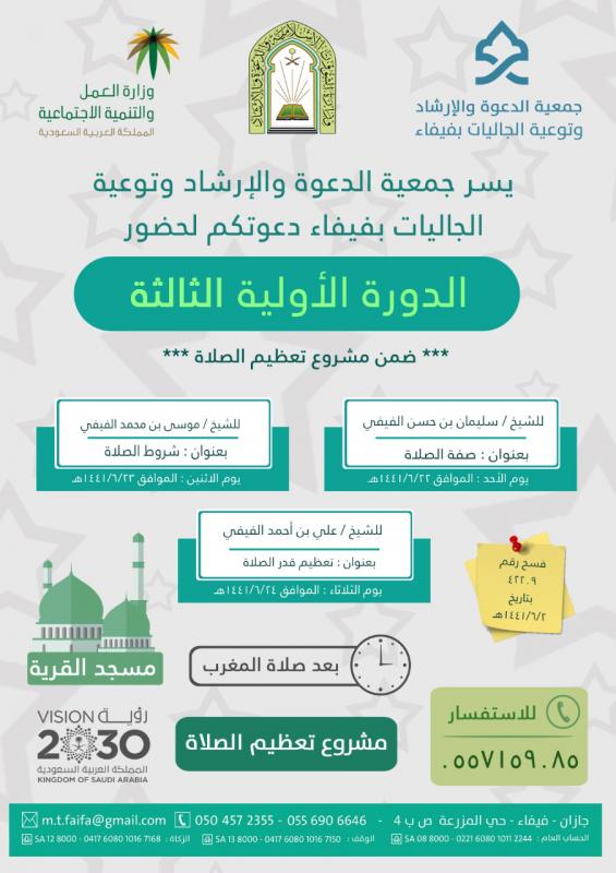 يسر جمعية الدعوة والإرشاد وتوعية الجاليات بمحافظة فيفاء عن دعوتكم لحضور برنامج الدورة الأولية الثالثة ضمن مشروع تعظيم الصلاة وذلك بمسجد القرية