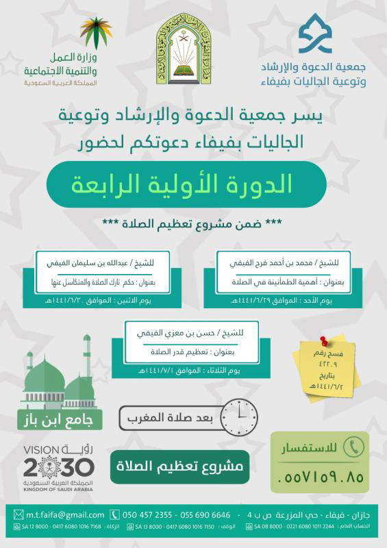 يسر جمعية الدعوة والإرشاد وتوعية الجاليات بمحافظة فيفاء عن دعوتكم لحضور برنامج الدورة الأولية الرابعة ضمن مشروع تعظيم الصلاة وذلك بجامع ابن باز