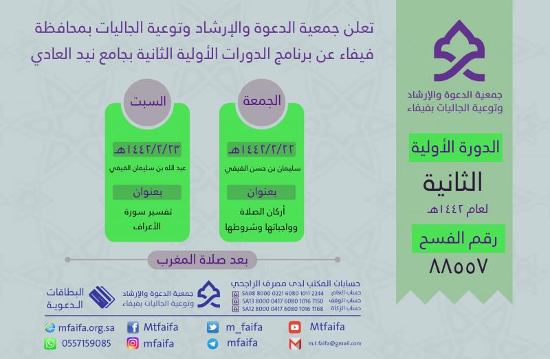 يسر جمعية الدعوة والإرشاد وتوعية الجاليات بمحافظة فيفاء  دعوتكم لحضور برنامج الدورة الأولية الثانية وذلك بجامع نيد العادي