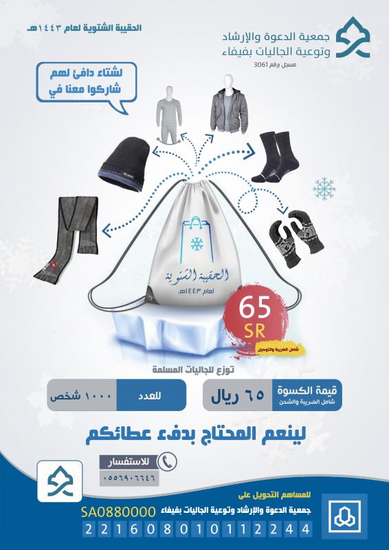 مشروع الحقيبة الشتوية بجمعية الدعوة والإرشاد وتوعية الجاليات بمحافظة فيفاء لعام 1443هـ والتي سوف يتم توزيعها للجاليات وهدفنا في هذا المشروع تغطية ألف حقيقة يتم توزيعا مباشرة بعد تغطية المشروع على الجاليات بالمحافظة