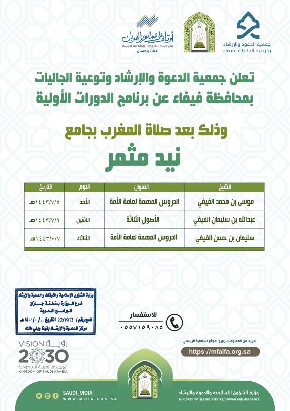 يسر جمعية الدعوة والإرشاد وتوعية الجاليات بمحافظة فيفاء دعوتكم لحضور برنامج الدورة الأولية السادسة وذلك بجامع نيد مثمر بمحافظة فيفاء والمدعومة من أوقاف علي بن عبدالعزيز الضويان الخيرية والتي تبدأ من بعد صلاة المغرب مباشرةً وذلك حسب التفاصيل آدنا :