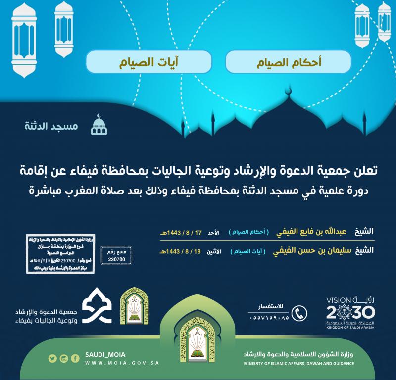 تعلن جمعية الدعوة والإرشاد وتوعية الجاليات بمحافظة فيفاء عن إقامة دورة علمية في مسجد الدثنة بمحافظة فيفاء وذلك بعد صلاة المغرب مباشرة حسب التفاصيل أدناه :