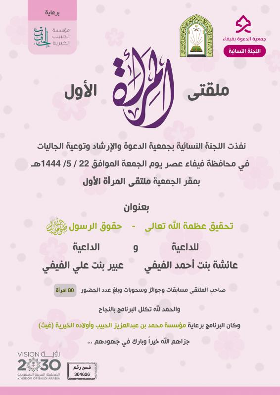 نفذت اللجنة النسائية بجمعية الدعوة والإرشاد وتوعية الجاليات في محافظة فيفاء عصر يوم الجمعة الموافق 22 / 5/ 1444هـبمقر الجمعية