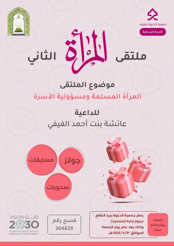 تسر اللجنة النسائية بجمعية الدعوة والإرشاد وتوعية الجاليات بفيفاء دعوتكن لحضور ملتقى المرأة الثاني بعنوان