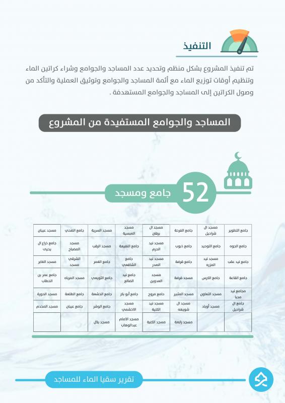• سد احتياج توفير المياه للمساجد بالمحافظة لراحة المصلين وتلبية احتياجاتهم.