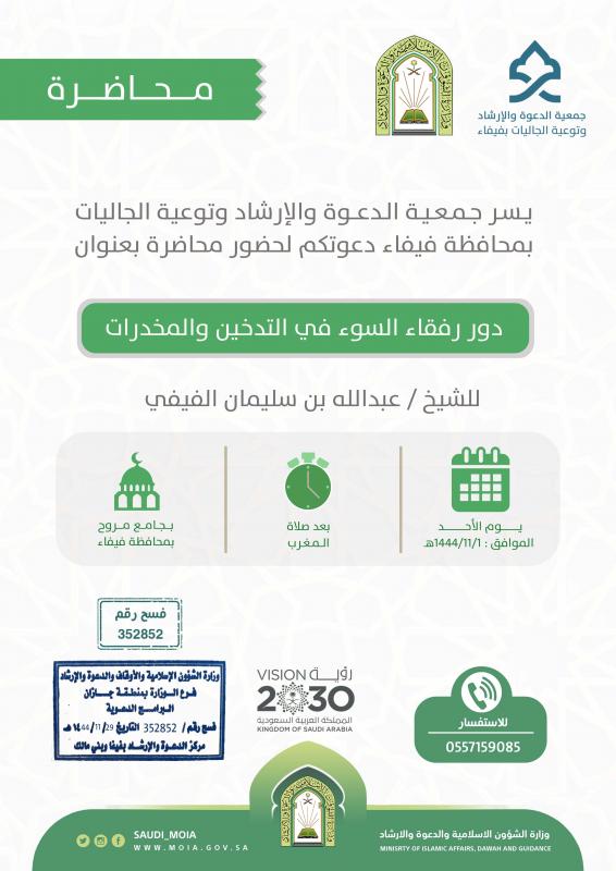 يسر جمعية الدعوة والإرشاد وتوعية الجاليات بمحافظة فيفاء دعوتكم لحضور محاضرة بعنوان
