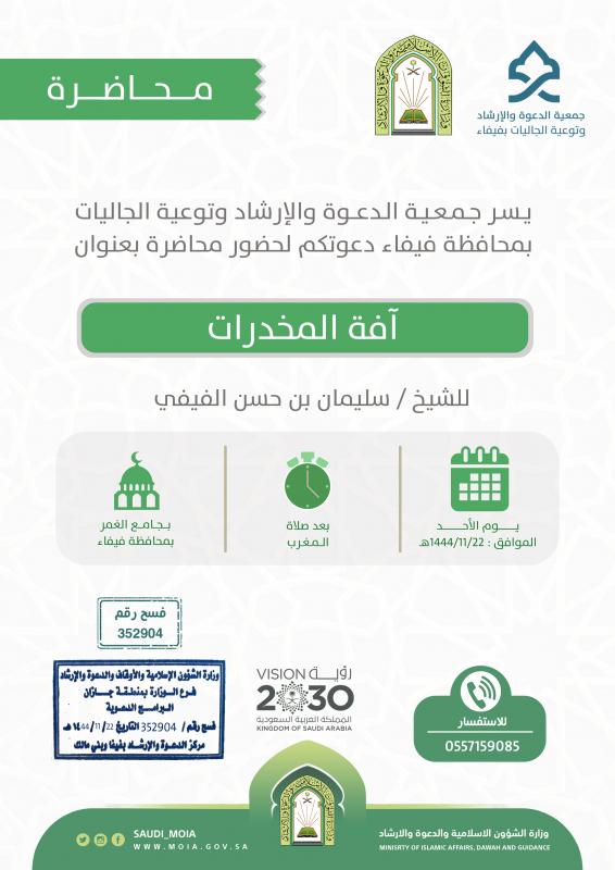 يسر جمعية الدعوة والإرشاد وتوعية الجاليات بمحافظة فيفاء دعوتكم لحضور محاضرة بعنوان