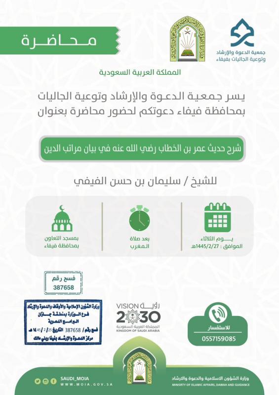 يسر جمعية الدعوة والإرشاد وتوعية الجاليات بمحافظة فيفاء دعوتكم لحضور محاضرة بعنوان