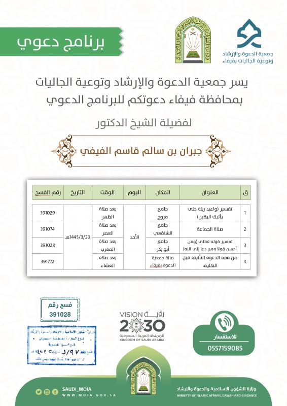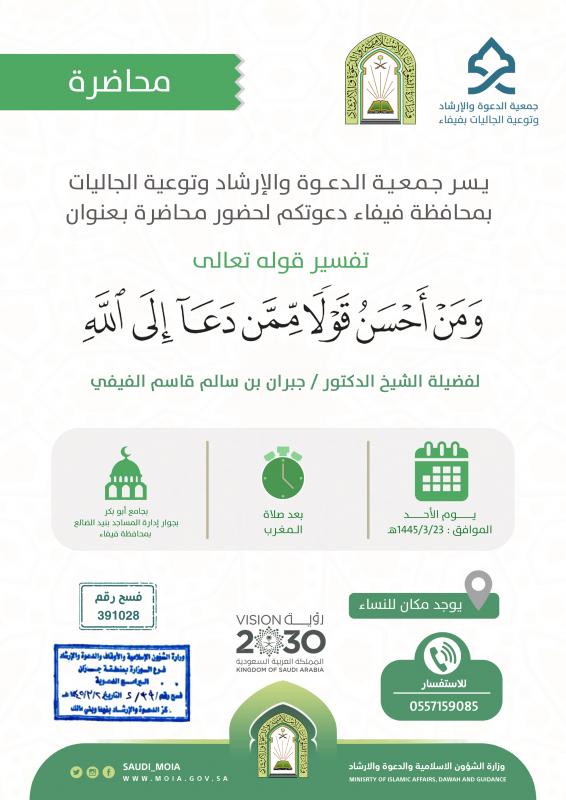 يسر جمعية الدعوة والإرشاد وتوعية الجاليات بمحافظة فيفاء دعوتكم لحضور محاضرة بعنوان