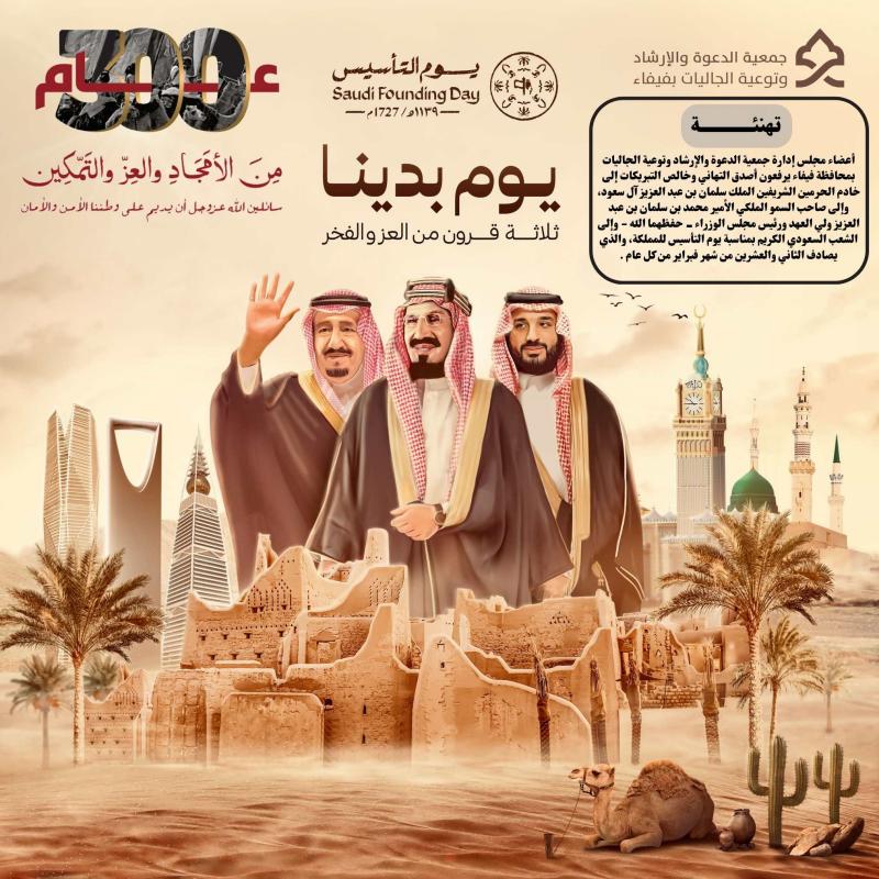 أعضاء مجلس إدارة جمعية الدعوة والإرشاد وتوعية الجاليات بمحافظة فيفاء يرفعون أصدق التهاني وخالص التبريكات إلى خادم الحرمين الشريفين الملك سلمان بن عبدالعزيز آل سعود، وإلى صاحب السمو الملكي الأمير محمد بن سلمان بن عبد العزيز ولي العهد ورئيس مجلس الوزراء - حفظهما الله - وإلى الشعب السعودي الكريم بمناسبة يوم التأسيس للمملكة، والذي يصادف الثاني والعشرين من شهر فبراير من كل عام .