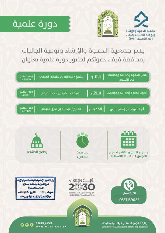 تعلن جمعية الدعوة والإرشاد وتوعية الجاليات بمحافظة فيفاء عن إقامة دورة علمية في جامع الخشعة بمحافظة فيفاء وذلك بعد صلاة المغرب مباشرة حسب التفاصيل أدناه :