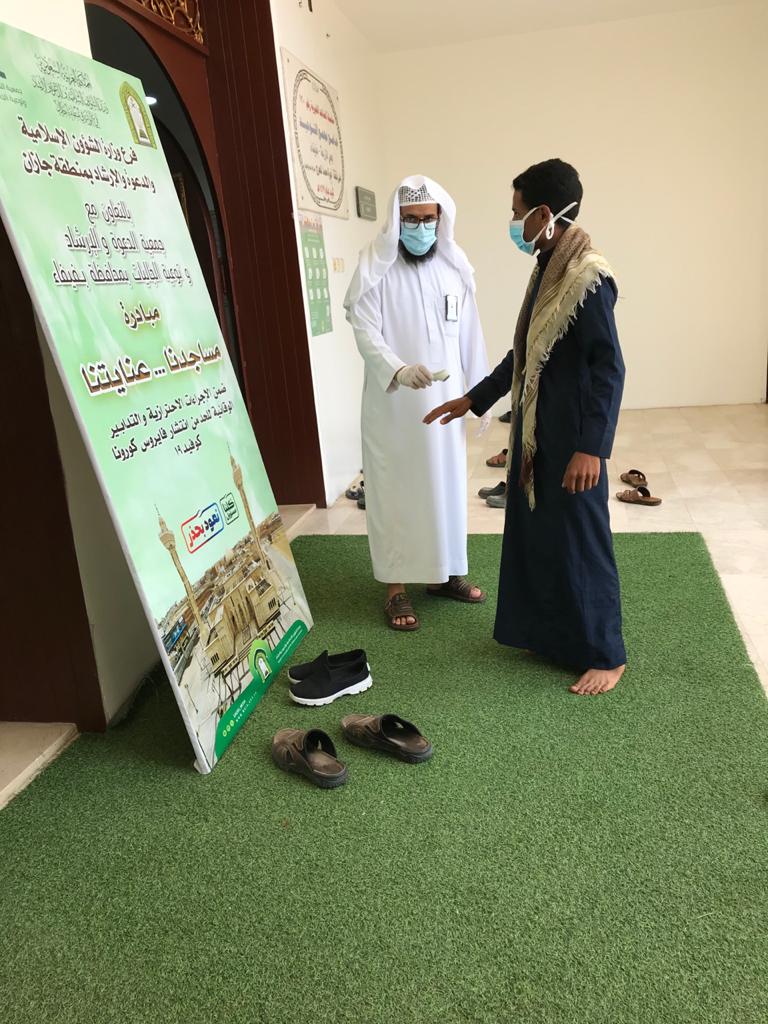 قامت جمعية الدعوة بفيفاء ولجنة التنمية الأهلية بفيفاء بالتعاون مع فرع وزارة الشؤون الإسلامية بجازان ومركز الدعوة بفيفاء ضمن مبادرة مساجدنا عنايتنا بتنظيم دخول وخروج المصلين في جوامع ومساجد المحافظة واستقبال المصلين للتأكد من الإجراءات الوقائيةحيث تم قياس درجة الحرارة وتوزيع الكمامات والتعقيم وتنظيم الصفوف وتوزيع المصلين في المواقع المخصصة داخل الجوامع وشوهد التزام المواطنين والمقيمين في فيفاء بالتعليمات الوقائية والاحترازية للحد من انتشار فيروس كورونا