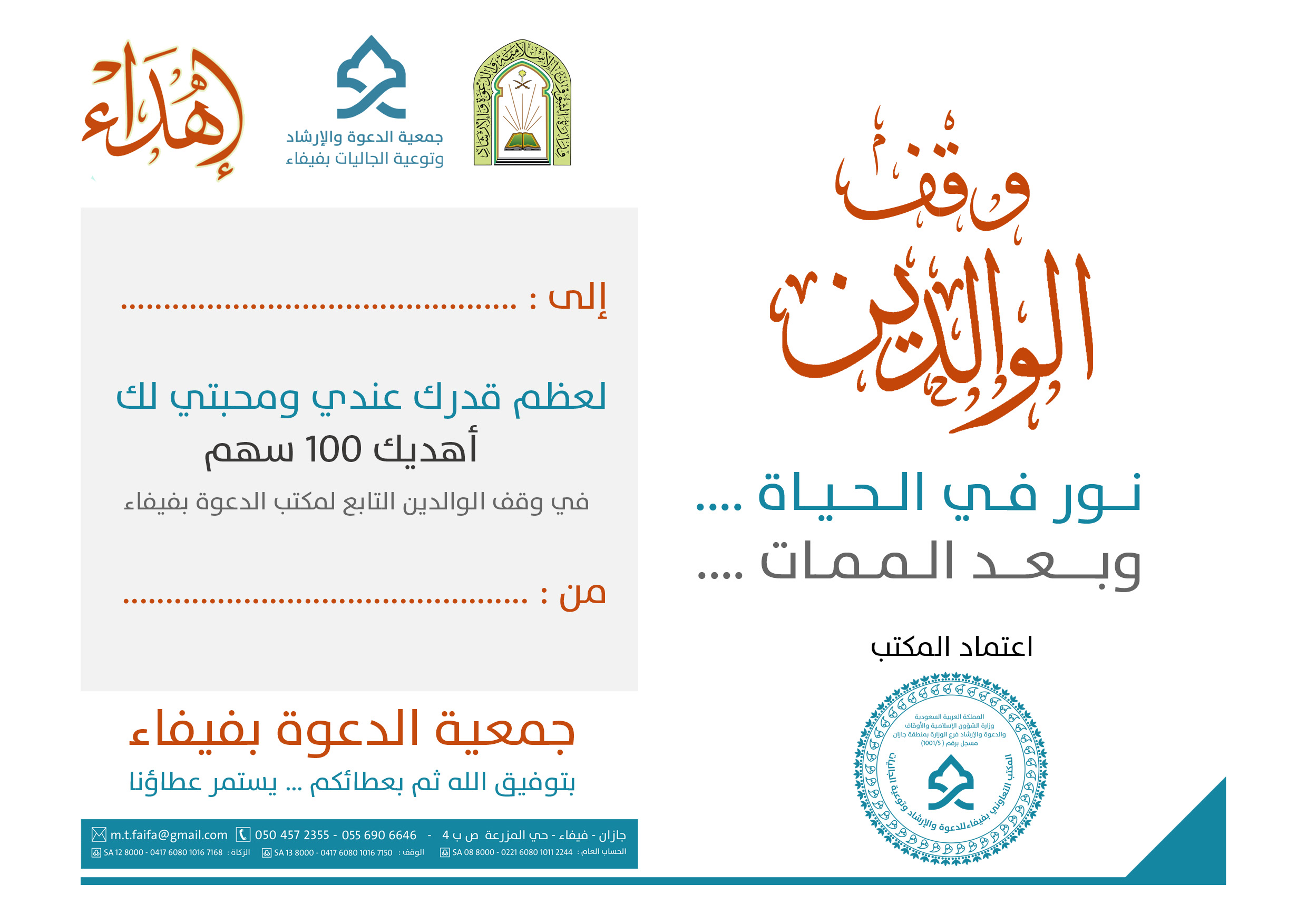 مبادرة إهداء وقف الوالدين جمعية الدعوة والإرشاد وتوعية الجاليات بمحافظة فيفاء تضع بين أيديكم خدمة بطاقة إهداء في وقف الوالدين إذا كان لك قريب أو حبيب أو حتى صاحب تفكر تهدي له هدية يمكنك ذلك  الآن إلكترونيًا