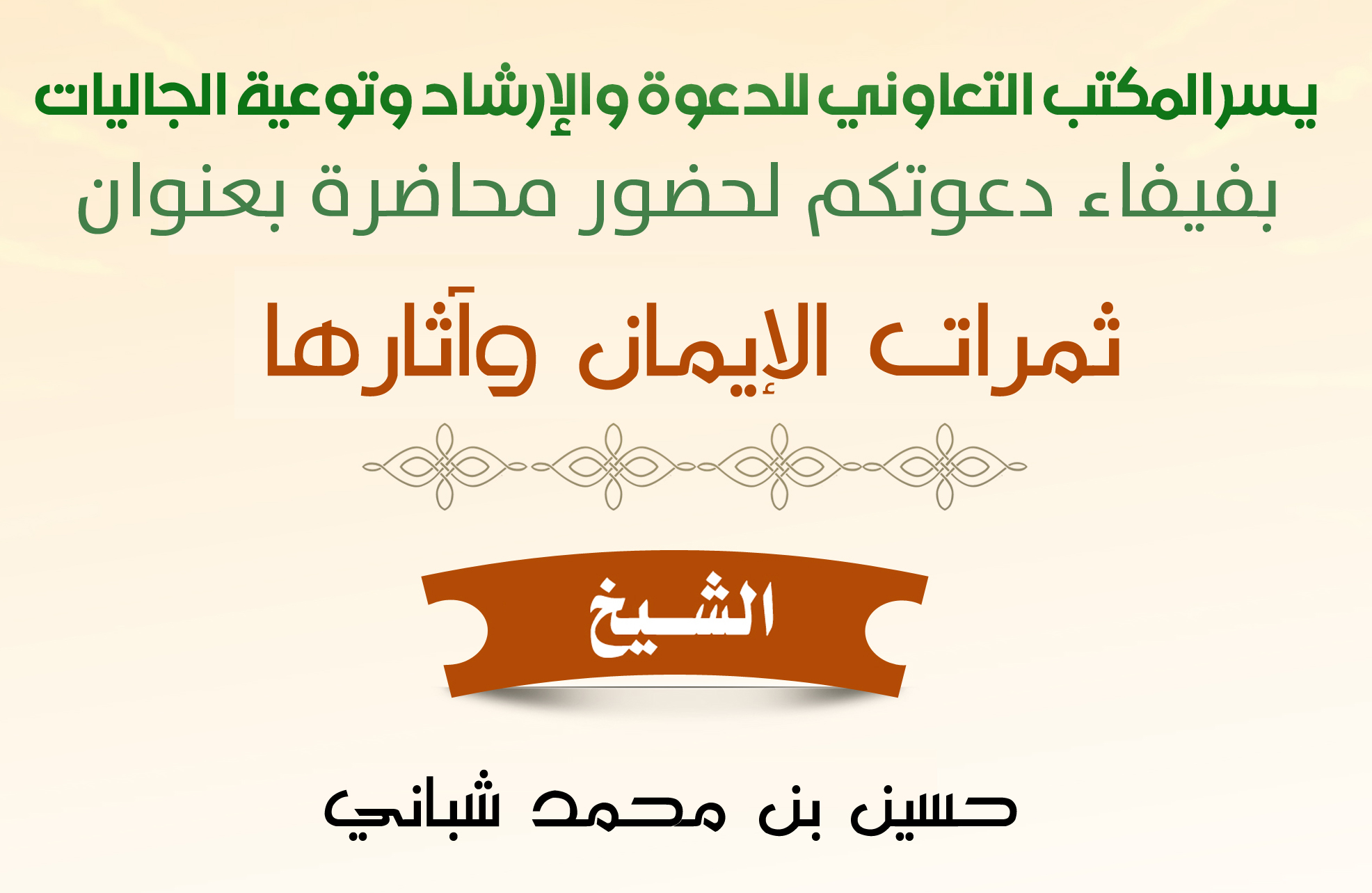 يعلن المكتب التعاوني للدعوة والإرشاد وتوعية الجاليات بمحافظة فيفاء عن إقامة  محاضرة للشيخ / حسين بن محمد شباني بعنوان ثمرات الأيمان وآثارها وذلك بجامع الفرحة بالدفرة بعد صلاة المغرب يوم السبت الموافق 20/2/1441هـ .
