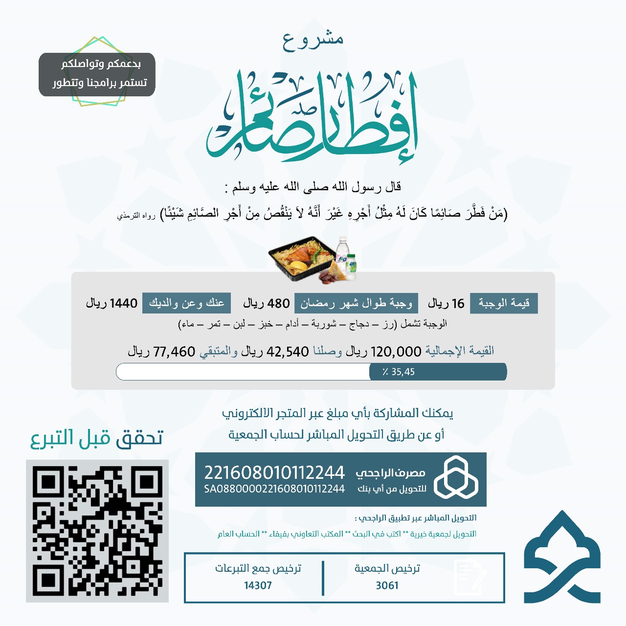 - قيمة الوجبة 16 ريال تشمل (رز – دجاج – شوربة – أدام – خبز – لبن – تمر – ماء)